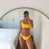 Bikini de un hombro con bombacha entera colaless. Todos los conjuntos traen abertura para agregar tazas.