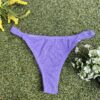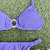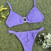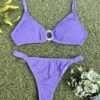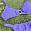 Bikini con corpiño tipo top con hebilla redonda en el centro y bombacha vedetina entera con frunce en los costados. Trae tazas soft incluidas. Tela texturada