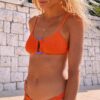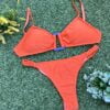 Bikini con corpiño tipo top con hebilla rectangular en el centro y colaless entera. Trae tazas soft incluidas.