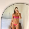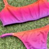 Bikini con corpiño tipo top con colaless regulable en tela lurex brillante. Todos los conjuntos vienen con abertura en el corpiño para agregar tazas.