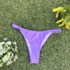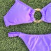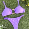 Bikini con corpiño tipo top con hebilla marrón redonda en el centro y colaless entera con frunces en los costados. Trae tazas soft incluidas.