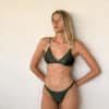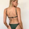 Bikini triángulo fijo con argollas en el bretel y bombacha vedetina (ancha atrás). Trae abertura en el corpiño para agregar tazas.