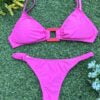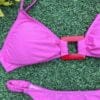 Bikini con corpiño tipo top con hebilla cuadrada en el centro y colaless entera con frunce en los costados. Trae tazas soft incluidas.