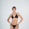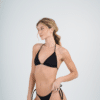 Conjunto triangulo separado con bombacha colaless con tiras para atar en los costados. Tela texturada. Trae abertura para agregarle tazas.